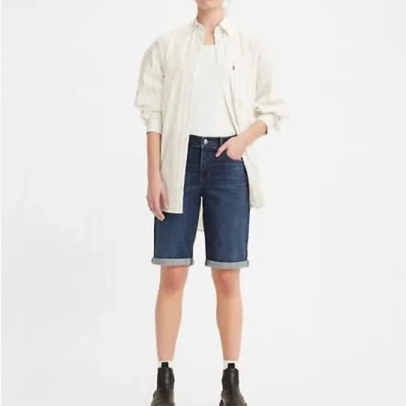 Levi's Classic Bermuda Denim Shorts in Lapis Midnight - Size 30. Excellent pre-owned condition. Slim through hip and thigh, bermuda length, medium wash, zip fly with button closure, 5 pockets, roll ups in model pic are not secured. Approximate measurements: 16 1/2" waist, 10" rise, 11 1/2" inseam.
