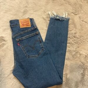 Stylish cropped jeans by Levi's. Features a classic blue hue. Perfect for casual wear.
