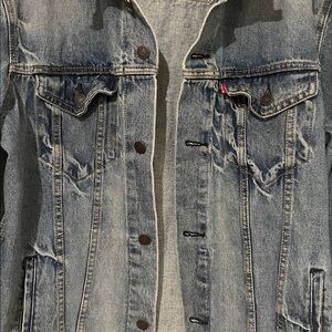Stylish Levi's denim jacket. Features button-up front. Perfect for casual wear.