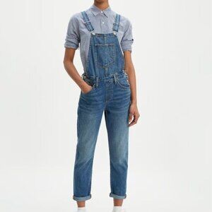 Levi's Classic Denim Overalls Distressed Blown Out Knee Size S. Waist 16", Rise 9", Inseam 27", 5 Pocket Style, Button Closure, Adjustable Straps, Classic, Cotton, Farmer, Everyday, Comfort, Retail $128. Good Pre-Owned Condition