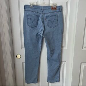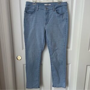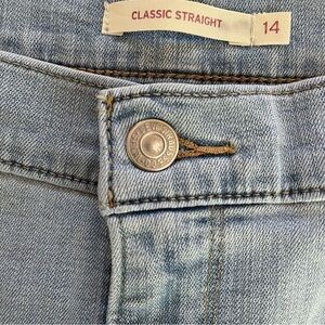 Levi’s Classic Straight Light Blue Jeans. Classic five pocket styling. Straight leg, mid-rise. Soft brushed, breathable cotton/viscose blend. Intentional whisker feathering distressing in front hip area. Size 14