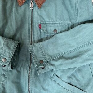Levi's Cotten Canvas Utility Jacket Men's Green. Full Zip, adjustable snap cuffs, snap enclosure front pocket.