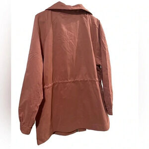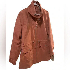 Functional cinch waist utility jacket with an adjustable bungee cord waist and collar, two lower snap pockets with side entry, elasticized cuffs, and a center front zipper closure.