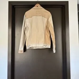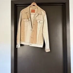 Rare Levi's two-tone trucker silhouette in light cream and tan denim. Features chest flap pockets and button-front closure. Day to night, styled casual with jeans and dressed up with dress pants and loafers.