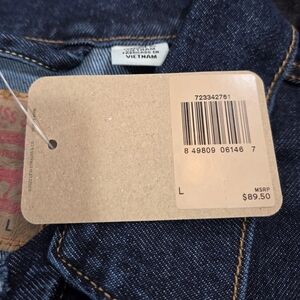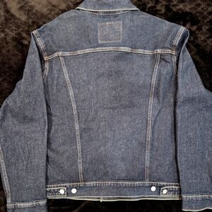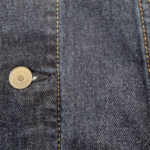 Stylish Levi's jacket in dark blue denim. Features button closure and chest pockets. Ideal for layering.