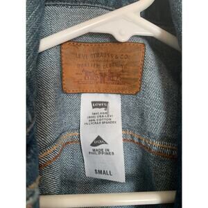 Upgrade your denim game with this Levi's dark wash denim jacket in women's size S. Perfect for any season, this jacket adds a touch of edginess to any outfit. The dark wash gives it a sleek yet casual look. Effortlessly stylish!