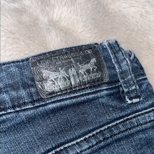 Stylish dark wash jeans with unique pocket design. Comfortable fit.