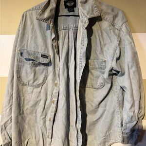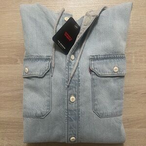 Levi's trucker denim jacket in dark tones. Features a brown corduroy collar. Unique patches add character. Preowned in excellent condition! Men’s size small, pit to pit 20 inches.