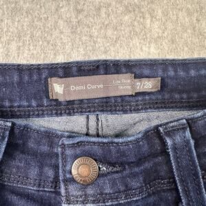 The Levi's Demi Curve Jeans in dark blue are designed for women in size 7/28. These low-rise skinny jeans feature stretch denim for a comfortable fit, offering a sleek and flattering look perfect for casual and everyday wear.