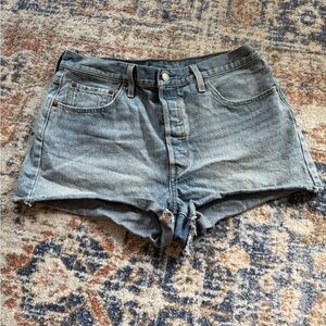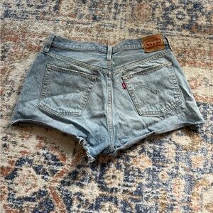 Classic Levi's jean shorts in light blue. Features a frayed hem and five-pocket design. Perfect for casual wear.