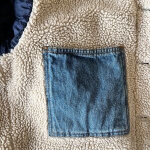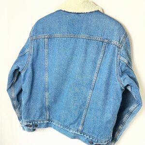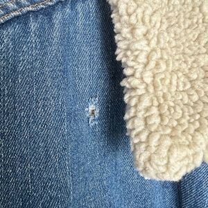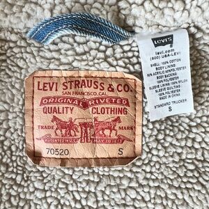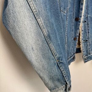 Levi Strauss men’s denim jacket with shearling lining in size Small. Style number 70520-3790. Shearling is an off-white to light tan color. In excellent shape, with one small hole near the collar (pictured). 4 exterior pockets plus inner pocket. Medium blue denim with extra fading on the right arm. Measurements are 22” across the chest, 24” long from the shoulder, and 24” sleeve length.