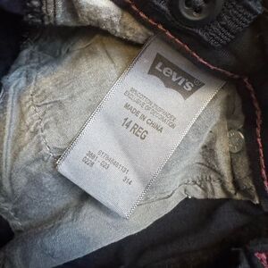 Levi's jeans with a unique black and pink tie-dye design. Perfect for making a statement.