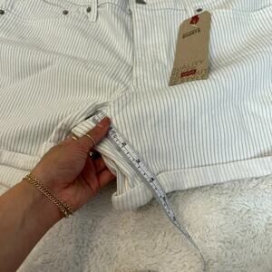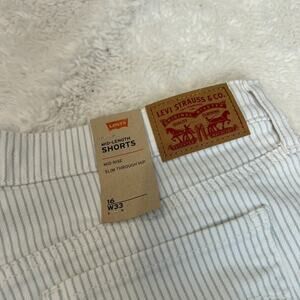 The product is a pair of Levi's denim mid-length shorts in size 33 with a mid-rise and casual striped design for women. These shorts feature a zip closure, 5-pocket design, and a regular fit. Made of a cotton blend denim fabric, they have a 4-inch inseam and are machine washable. Ideal for wearing in the summer, fall, or spring, these shorts are versatile enough for casual occasions and can be styled with a variety of outfits.