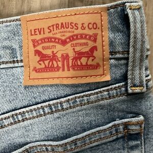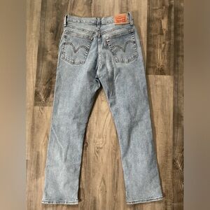 The product is a pair of Levi's denim jeans in a light blue color, size 29, with a button fly closure. These straight-cut jeans are designed for women and feature a distressed look, adding a trendy and edgy touch to the classic denim style. Made from high-quality denim fabric, these jeans are regular fit and perfect for everyday wear.