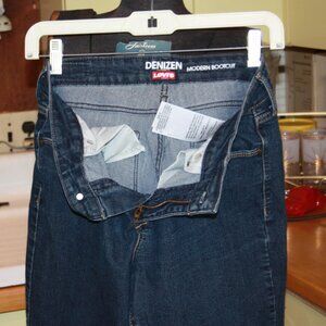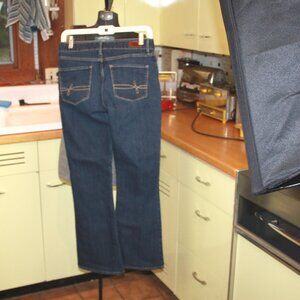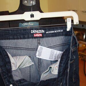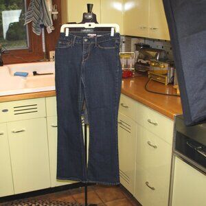 This is a pair of Levi's jeans. They are the basic jean style and dark blue. They are tagged as Modern Bootcut. There is some stretch to them. They are marked as size 6 S/C and are about 14 inches flat at the waist and the inseam is 29 inches. They are in very nice shape.