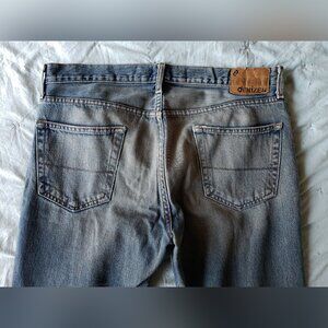 Well worn, in good vintage condition. Generous straight fit (not slim). Note the wear at the bottom of both legs (at rear).