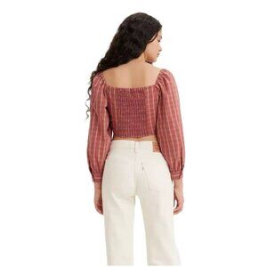 Levi's Devin Blouse Red Plaid Puff Long Sleeve Cinch Front Crop Top -- Size XS