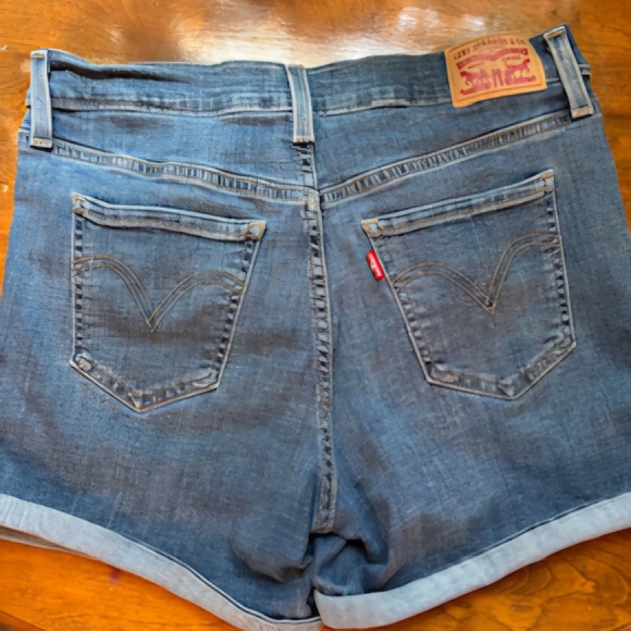 Trendy Levi's jean shorts with a distressed look. Classic blue denim. Ideal for casual wear.