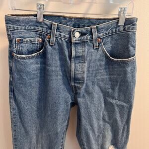 These Levi’s distressed 501 jeans are a size 28/26 and have been previously owned. They are in good condition