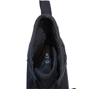 Levi's Elite Canvas High Top Cap Toe Shoes in Women’s size 6, Black color. These stylish high-top sneakers combine classic Levi's design with modern streetwear flair. Featuring a durable black canvas upper and a contrasting cap toe, these shoes offer both comfort and a timeless look that pairs well with jeans, shorts, leggings, or casual dresses. The lace-up closure provides a secure fit, while the cushioned insole ensures all-day comfort for walking, everyday wear, or casual outings. The rubber outsole delivers reliable grip and traction on various surfaces. These shoes are gently used and in excellent condition with very minimal wear—just a small amount of paint on the soles that doesn’t affect performance or appearance when worn. Perfect for fans of Levi’s footwear or anyone looking to add a versatile and fashionable sneaker to their wardrobe. Ideal for daily wear, commuting, school, travel, or weekend adventures. Hard-to-find style in great shape and ready to wear!