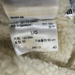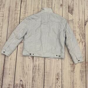 Levi’s Ex-Boyfriend Sherpa Trucker Jacket in light blue & white pinstripe corduroy, women’s size Large. Relaxed, slightly boxy trucker fit with warm sherpa lining and cozy stand collar. Snap-button front, two chest flap pockets, side hand pockets, and signature Levi’s red tab. New with tags (MSRP $98).