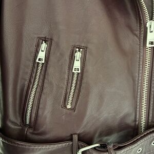 Excellent Condition: worn once. Levi's Faux Leather Moto Jacket Size XS. Asymmetrical zipper, removable belt, epaulettes. Fully lined with loads of zippers and pockets. Zippered sleeves. Dress up or down, the rich burgundy color pairs perfectly with jeans, a little black dress, wide-leg trousers, shorts, skirts. Easy care faux leather.