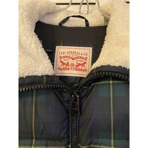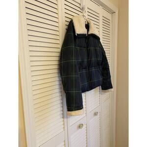 Good preowned condition. Levi Strauss women’s cropped nylon puffer jacket with faux shearling collar and sleeves in green plaid with two side zipper pockets.
