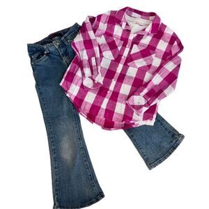 Levi's Flare Jeans Girls Outfit Christmas Tee & Plaid Buttoned Long Sleeve 6/6x