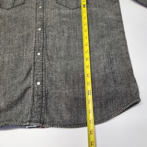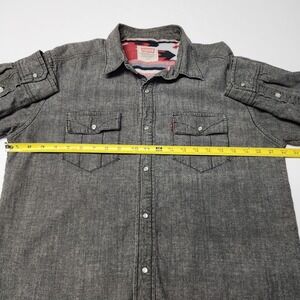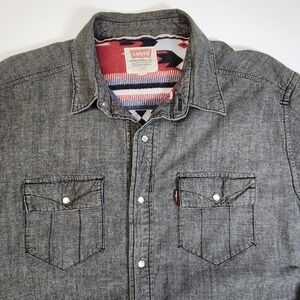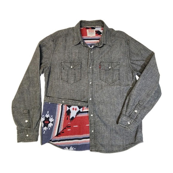 Classic Levi's western shirt jacket with a cozy Southwestern / Aztec fleece blanket lining. Gray chambray cotton exterior with snap-front closure, dual snap chest pockets, and traditional western yoke detailing.