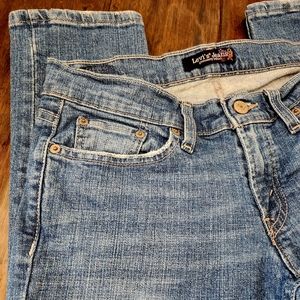 Levi's medium wash skinny Genuinely Crafted jeans. With nice thick detailed embroidery on back pockets. Five pockets and button/zipper fly. Factory whiskering, fading, and distressing at pockets and hemlines. These jeans have stretch to them. Juniors size 9M.