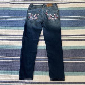 Levi’s 710 girls super skinny blue jeans, embroidered dove bling pockets, size 6.