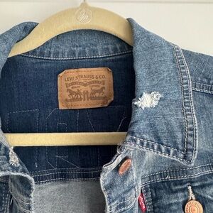 Levi’s denim jacket, girls jean jacket, distressed denim jacket, cropped jean jacket, Levi’s kids outerwear, classic blue jean jacket, back to school outfit, casual layering jacket, youth Levi’s medium, vintage inspired jacket, streetwear kids, retro denim jacket, versatile outerwear, spring jacket, fall jacket, Y2K kids fashion, cottagecore layering, everyday denim