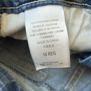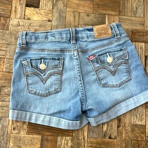 Levi’s Girls Shorty Shorts. Cuffed(sewn) hems. Button/zipper front closure. Rear has 2 button closure pockets. There is some stretch(1% elastane). I side waist has the stretch elastic with button to adjust fit. Size 10Reg