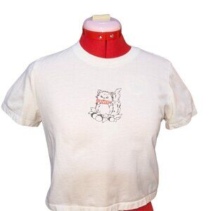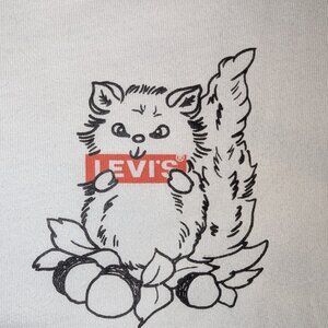 This quirky Levi’s tee brings feline flair to classic streetwear. Featuring a detailed graphic of a fluffy cat rocking a red Levi’s bandana surrounded by greenery, it’s a fun twist on the iconic logo. Made from soft cotton with a clean white base and crew neckline, this shirt adds personality to any laid-back outfit.