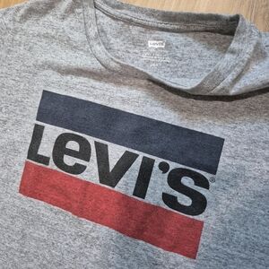 Gray tee featuring Levi's logo in bold red and black. Simple and stylish.