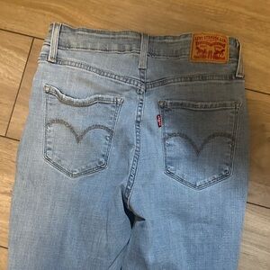 Chic high rise jeans with a light blue wash. Features stylish distressed details. Perfect for everyday wear.