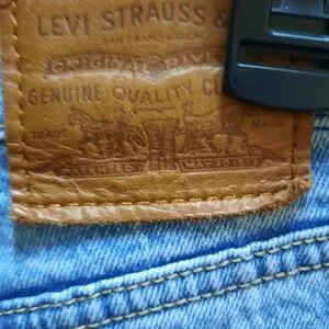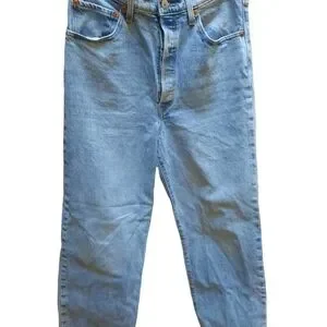 Classic Levi's high rise silhouette. Light blue denim with subtle fading. Straight leg and relaxed fit. Five-pocket styling with button fly. Timeless casual staple.