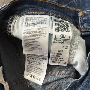 Levi's Rolled Cuff Stretch High Waist 4" Dark Wash Jean Shorts, Size 23. These mid-length shorts feature a zip fly with button closure. The material is 60% cotton, 23% Viscose, 16% Polyester, and 1% Elastane. In excellent condition with no defects.