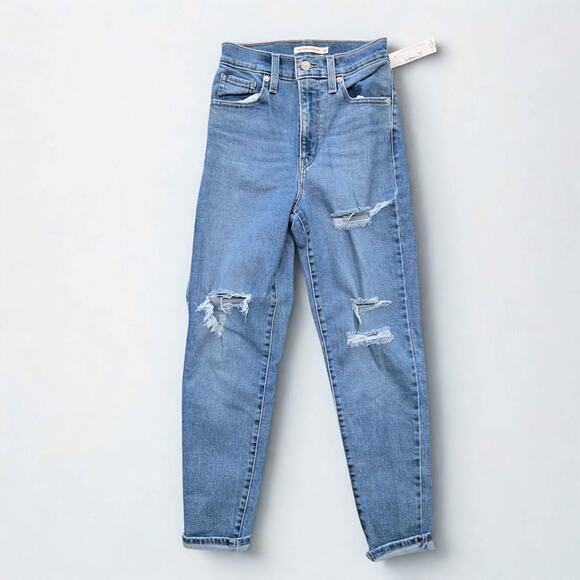 Elevate your everyday style with these classic Levi's High Waisted Mom Jeans. Featuring a medium wash with trendy distressed details, these jeans offer that coveted vintage-inspired fit that sits high on the waist and tapers through the leg. These are perfect for pairing with a tucked-in tee or an oversized sweater.