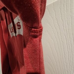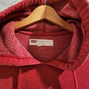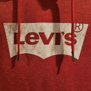 60% cotton, 40% polyester. Red Levi's hoodie with drawstring. Broken in look. Good clean condition. Size Small. Please compare measurements to something similar to ensure fit