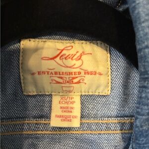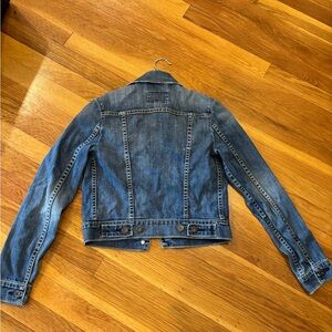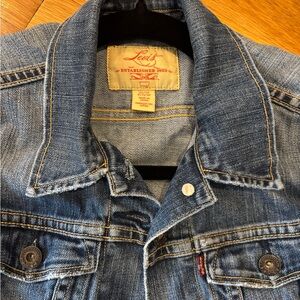 Stylish Levi's denim jacket. Features button closure and chest pockets. Slightly distressed edge’s. Slightly cropped. Women’s size XS. Gently used.