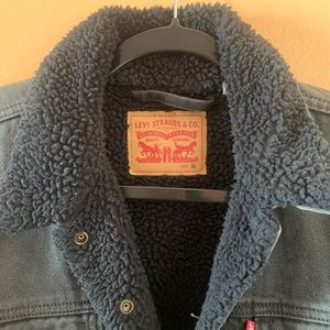 Levi’s jean jacket with sherpa lining. Super comfy and warm for the upcoming winter. The denim is faded black and the lining is full black. Only worn a few times and still has a lot of life in it ❄️