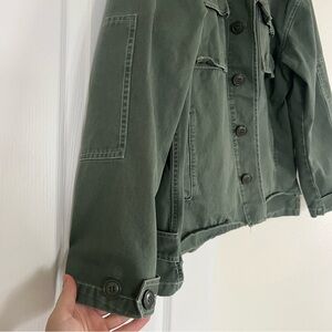 Distress look on bottom. 100% cotton.has arm and chest pockets. Great jacket overall.