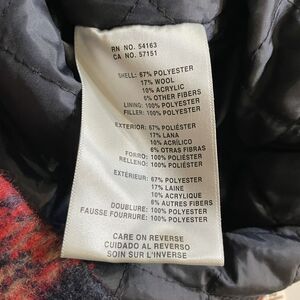 Elevate your winter wardrobe with this Levi's plaid wool blend jacket in size M. The classic trucker style features a button closure and long sleeves with button accents. The jacket is perfect for travel, casual outings, and workwear, and can be layered over any outfit for a cozy and stylish look. The multicolor plaid pattern is perfect for the holiday season and gives off a vintage 80s and 90s vibe. The jacket also features quilted polyester lining, keeping you warm during the colder fall and winter seasons. With pockets for added convenience, this Levi's jacket is a must-have for any fashion-forward woman looking to stay warm and stylish.