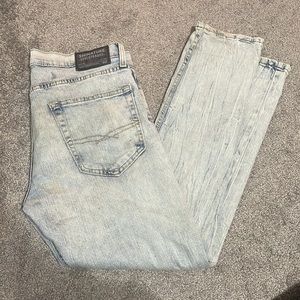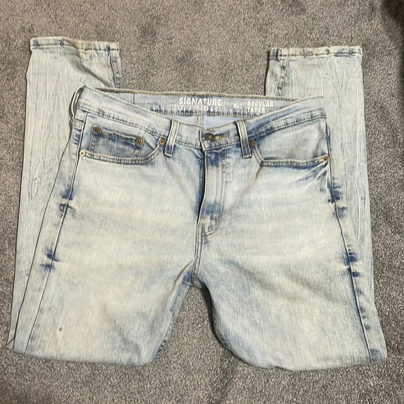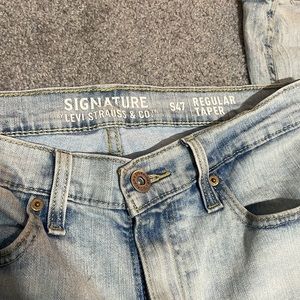 Levi’s jeans size 32x30, light wash strait leg style. These are slightly worn as pictured, no rips or tears.