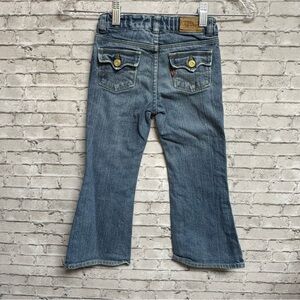 Levi's Jeans Flare Fit Kids 4 Regular Jeans Sparkle Buttons Flap Pockets. Good pre-owned condition - no noted stains/rips/tears. Shows signs of gentle wear.