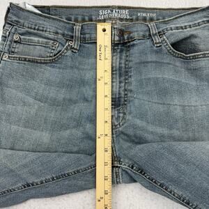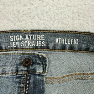 Levis Jeans Mens 36 X 32 Blue Denim Athletic Straight Signature Distressed. It is pre owned in fair condition with wear. There is a hole on the front and a few spots. Please see pictures. All measurements are approximate and done on a flat surface which can be seen in Pictures.