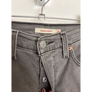 Levi's Wedgie Straight jeans in Cosmic Comet gray with vintage-inspired high rise silhouette. Features hidden button fly closure, fitted through hip and thigh with straight leg and 12-inch bottom opening. Made from 99% cotton and 1% elastane for low stretch durability with classic 5-pocket styling. Good preowned condition.
