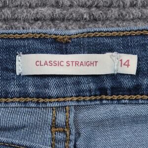 Levi’s Classic Straight women’s jeans in a medium blue wash with comfy stretch and a timeless straight leg. Tagged 14M – W32 L30 with zip fly and 5-pocket design. Inseam measures about 27" from crotch to hem (appears shortened vs tag length; see measurement photo). Easy everyday pair that dresses up with a blouse or down with a tee—super versatile. Color may vary slightly from photos due to lighting and monitor settings.
