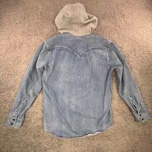 Levi's x Justin Timberlake Fresh Leaves denim western shirt jacket in a light wash blue. This unique piece features a heavy-duty full-zip front closure and a built-in grey jersey drawstring hood for a layered look. Designed with classic western styling, it includes pointed yokes on the front and back, snap-flap chest pockets, and triple-snap cuffs. The 100% cotton denim provides a rugged feel, while the relaxed fit and hooded detail offer a modern streetwear edge.